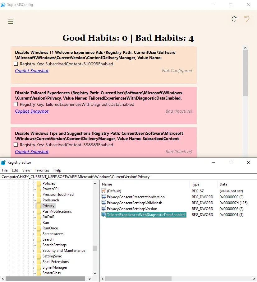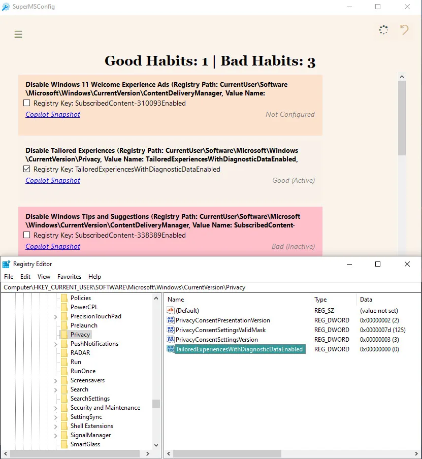 SuperMSConfig упрощает процесс, позволяя изменять только те параметры, которые связаны с улучшением пользовательского опыта и производительности ОС. Настройки разделены на категории, такие как Реклама, ИИ, Конфиденциальность, Безопасность, Ненужные программы, Автозагрузка и другие. В каждой категории есть записи политики реестра, которые отмечены как «Хорошие» или «Плохие» привычки, и их можно изменить одним кликом.