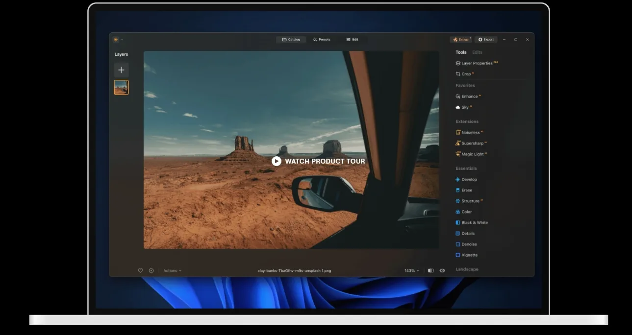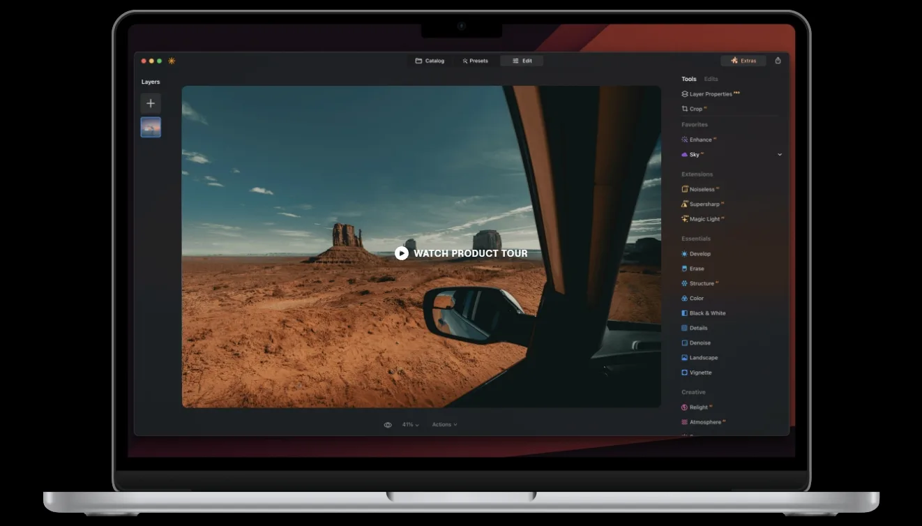 Supersharp AI, Noiseless AI, Upscale AI, Background Removal AI, HDR Merge, Focus Stacking, Magic Light AI, Panorama Stitching и другие инструменты для тонкой обработки и специальных задач