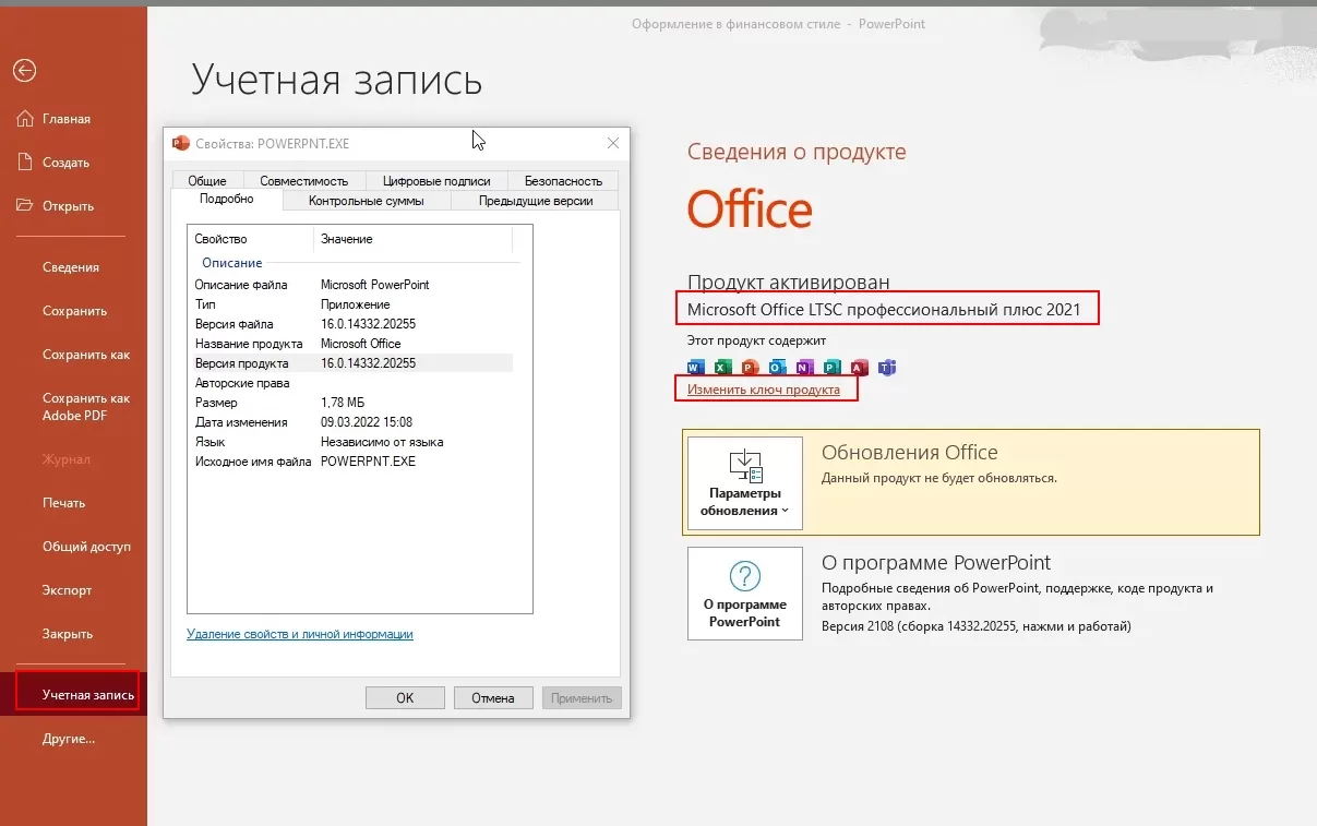 Дождитесь окончание установки, запустите Word из меню “Пуск”, перейдите в “Файл” > “Уч.запись” > “Сменить ключ” и введите приобретённый ключ.